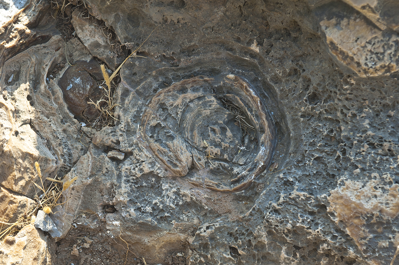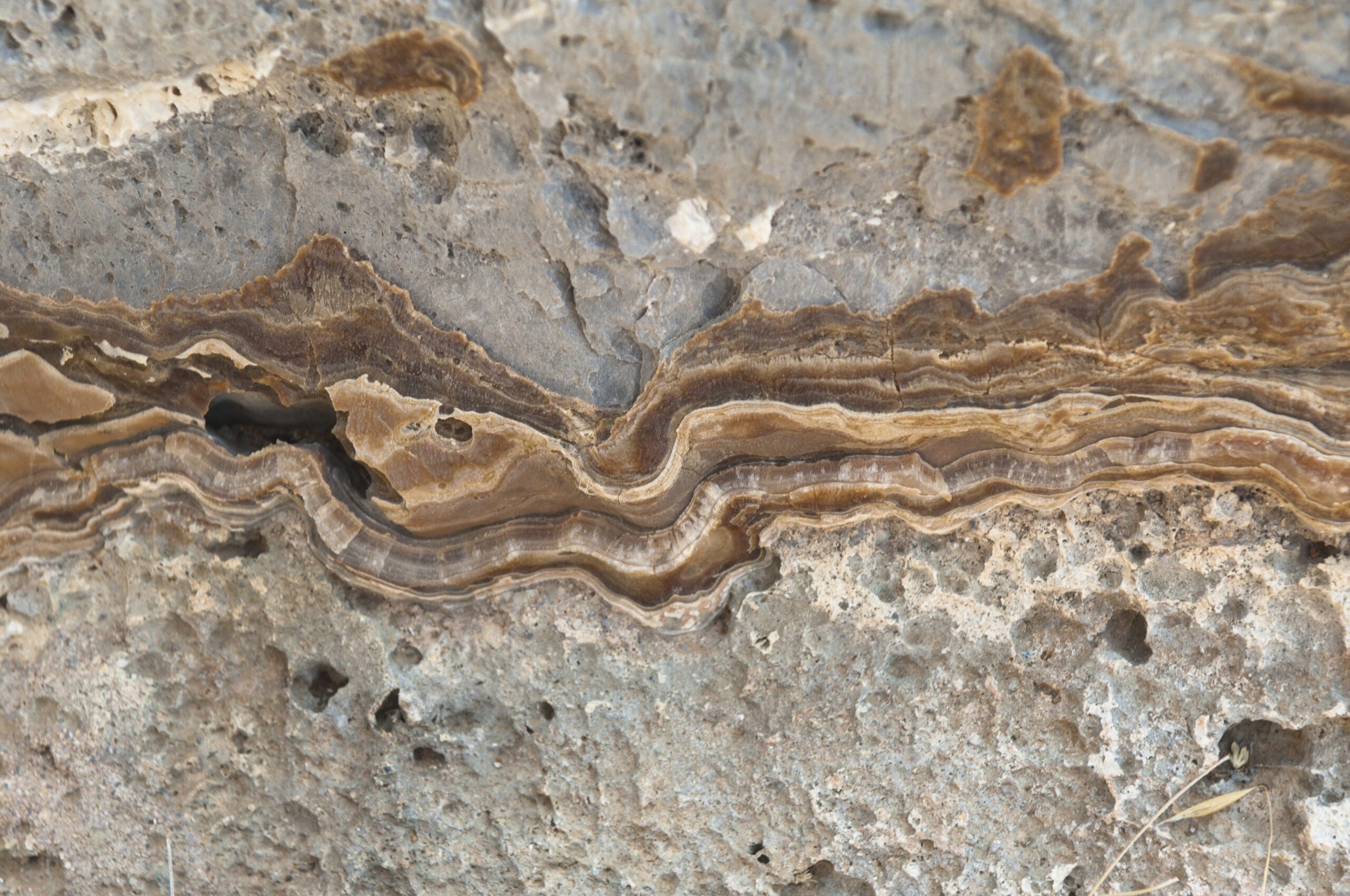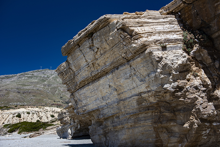 Rakennetussa ympäristössä sekä meren rannoilla kivettyneet tai kivettymässä olevat maaperän rakenteet on helppo löytää. Kuvassa Mirtosin kylän minolaisen asutuspaikan mäen kylki. Se löytyy muutama sata metriä Mirtosista Ierapetraan päin.